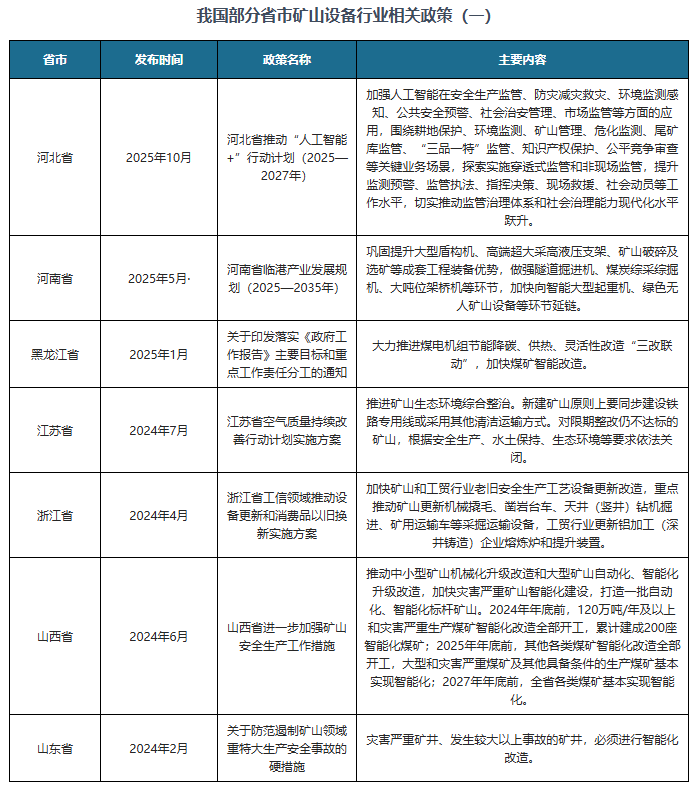 为推进矿山设备行业高质量成长,我国连续发布了多项政策,如2025年11月国务院办公厅发布《关于加速场景培育和鞭策新场景大规模使用的实施看法》集成云计较、工业互联网、无人驾驶等手艺,实现智能、智能决策、分析管控,提拔矿山平安出产全流程从动化程度,建立出产前提及时、过程可视可控、风险可测可防、要素可调可配的高程度矿山平安出产智能化使用场景。 我国各省市也积极响应国度政策规划,对各省市矿山设备行业的成长做出了具体规划,支撑本地矿山设备行业不变成长,好比海南省发布的《海南低碳岛扶植方案》、贵州省发布的《关于进一步加强矿山平安出产工做的实施看法》。 不雅研全国®专注行业阐发十四年,合作阐发、前景研判、趋向瞻望、策略等内容的研究演讲。更多本行业研究详见《中国矿山设备行业成长深度研究取投资前景预测演讲(2026-2033年)》。